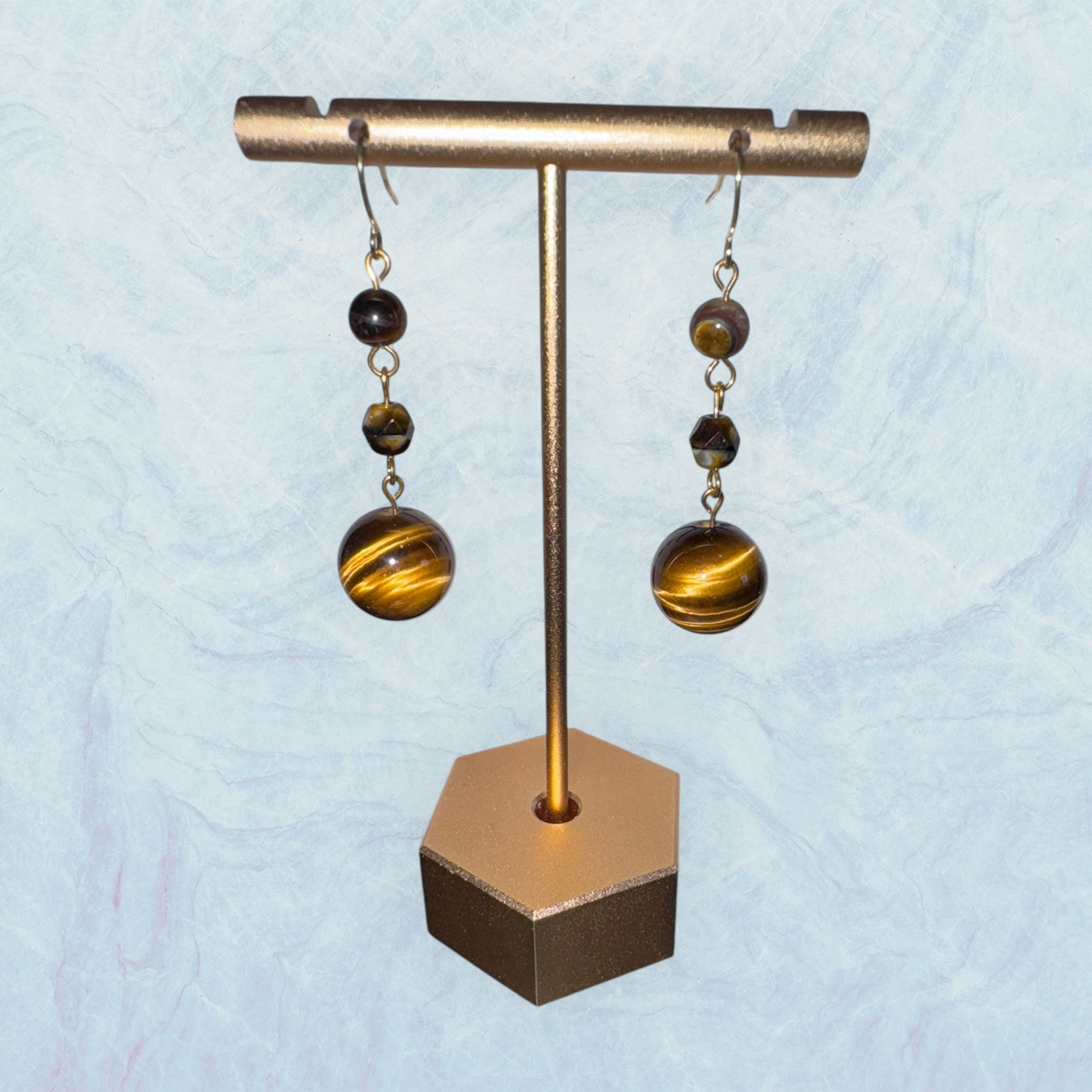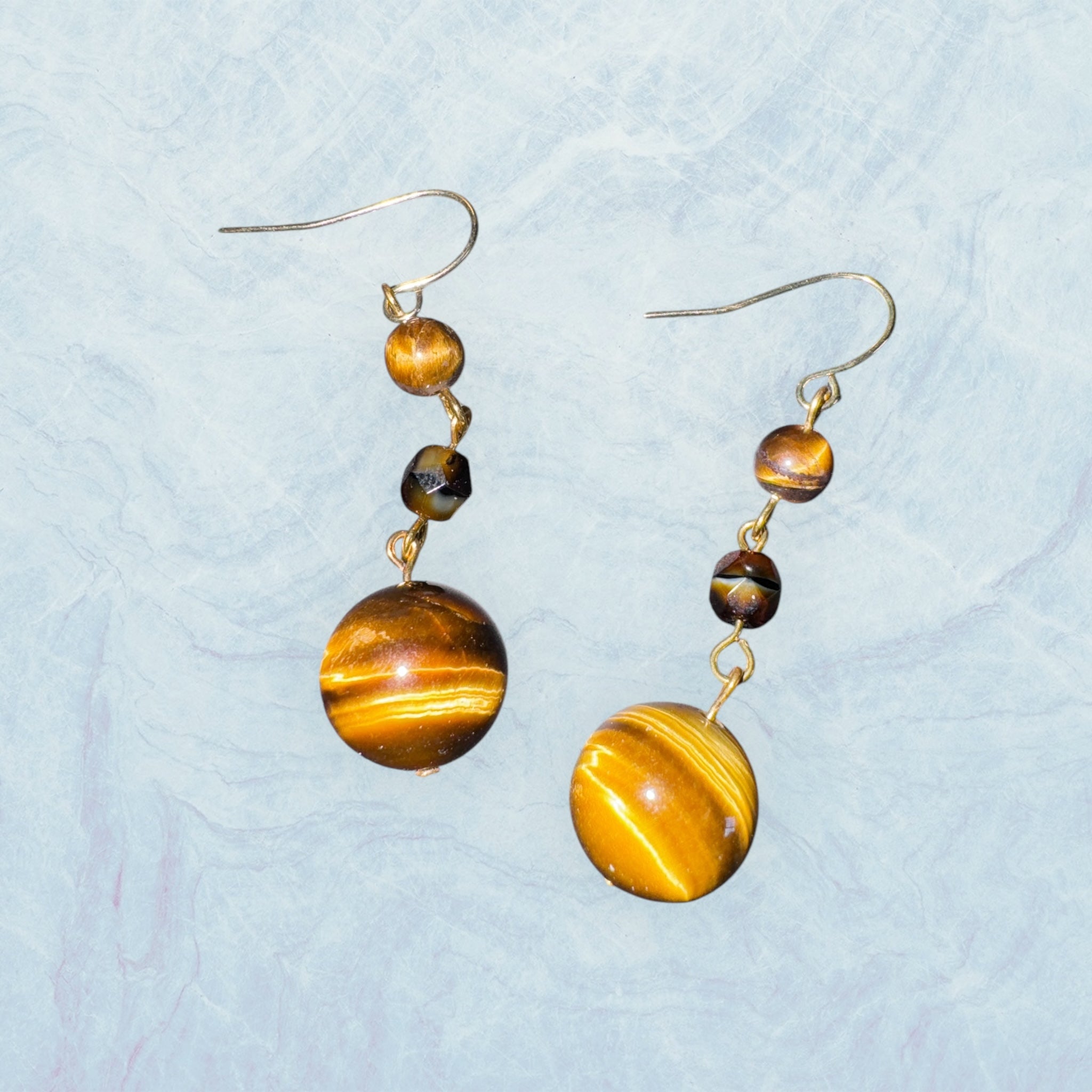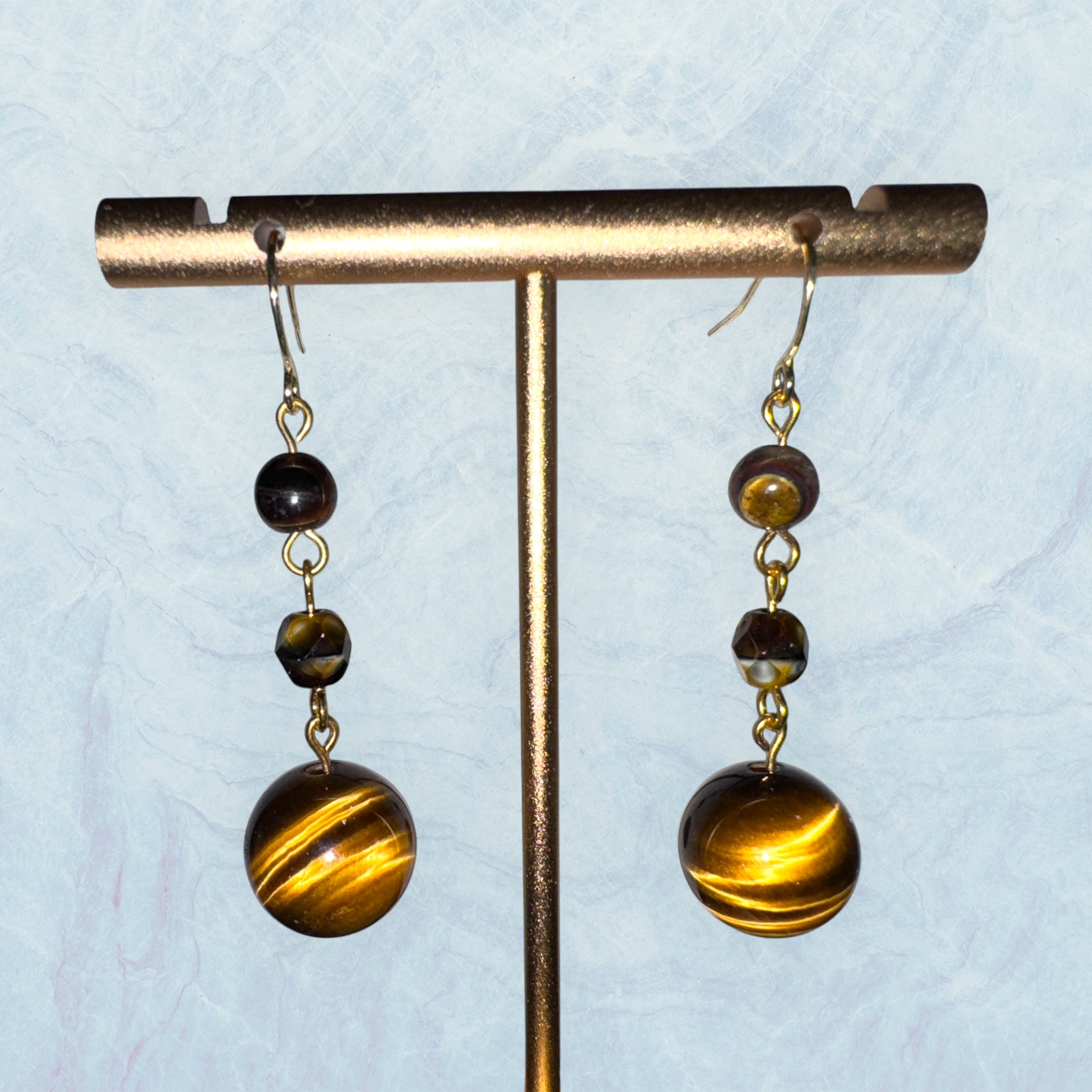 These striking earrings feature polished tiger’s eye stones, radiating golden-brown hues with a captivating chatoyancy. Accented by faceted beads and delicate gold details, they exude warmth and timeless elegance. Perfect for grounding your style with a touch of natural charm.