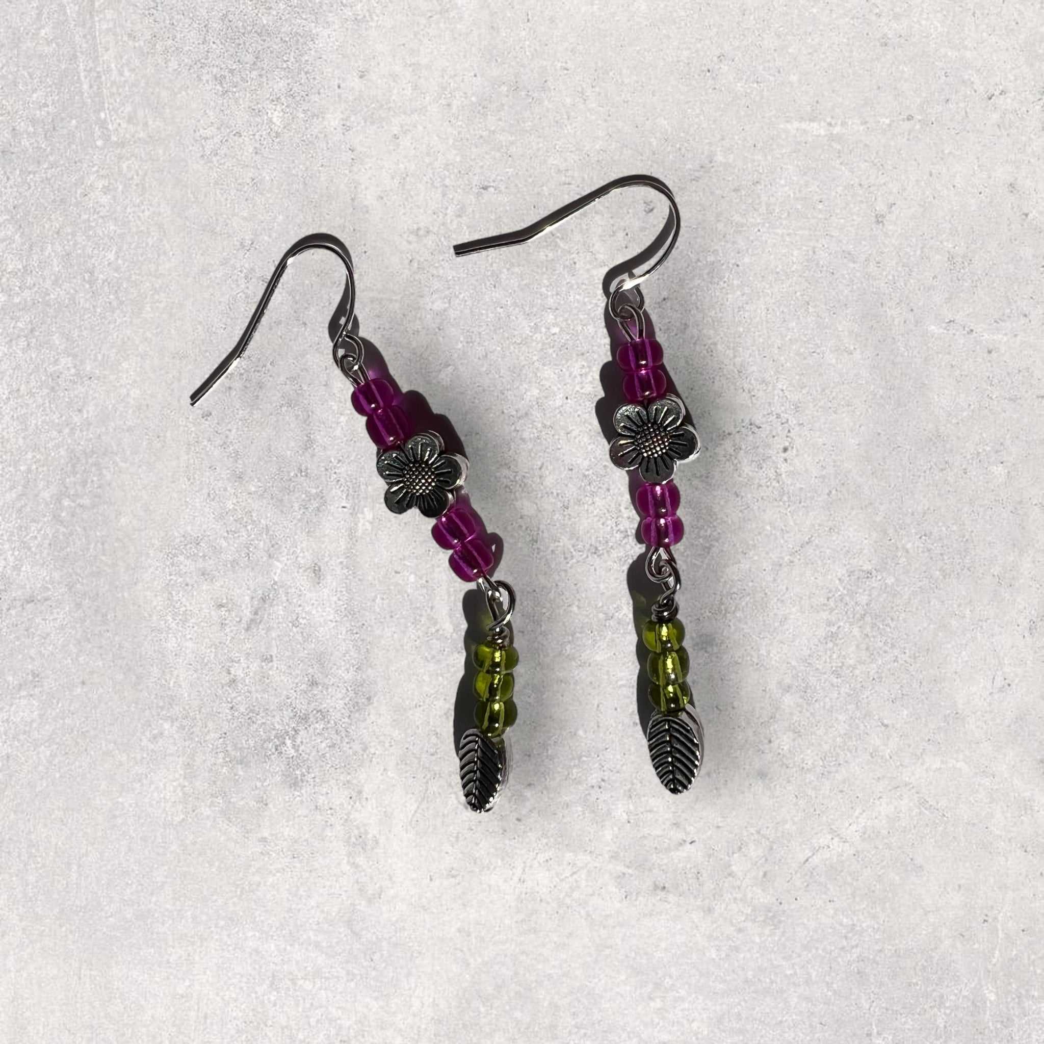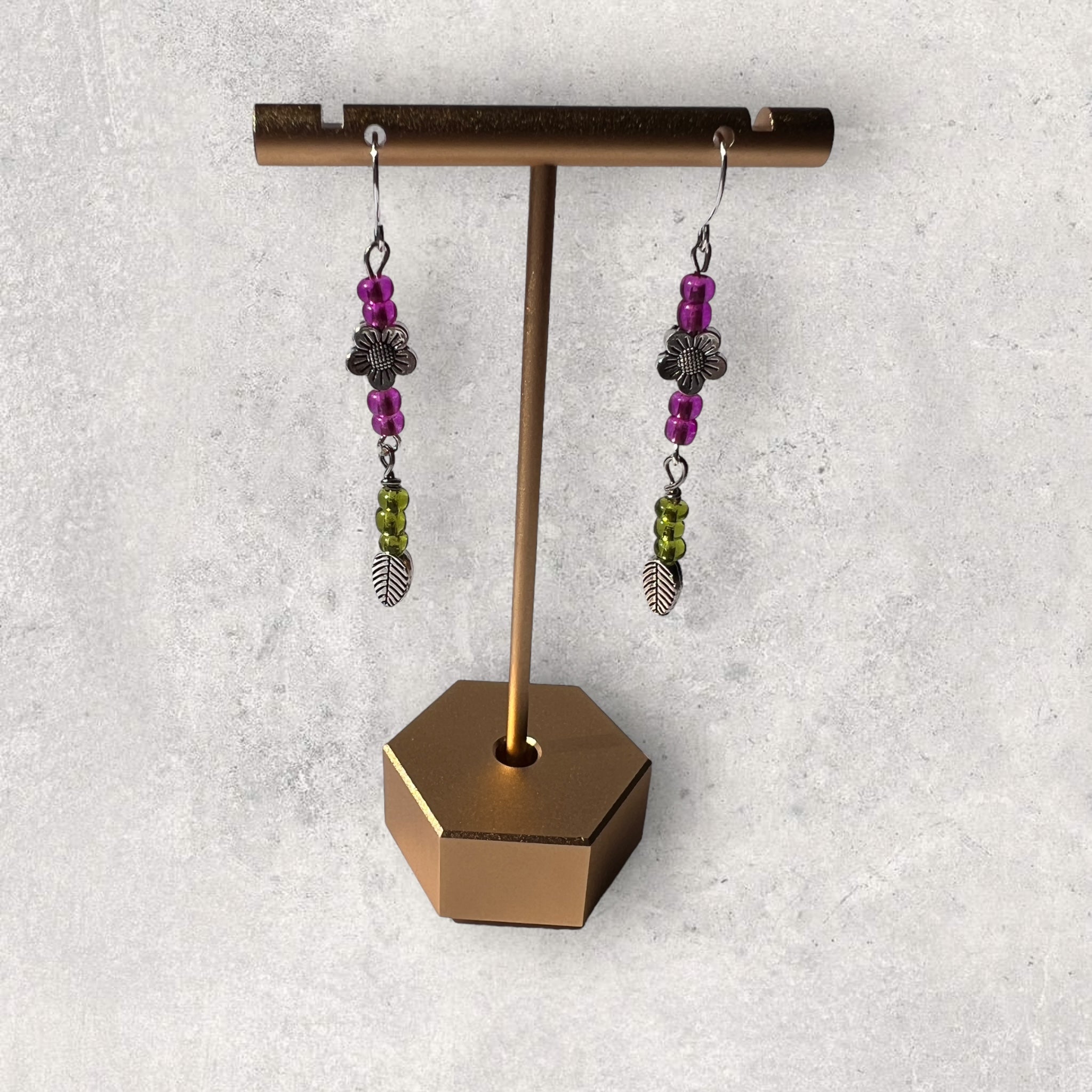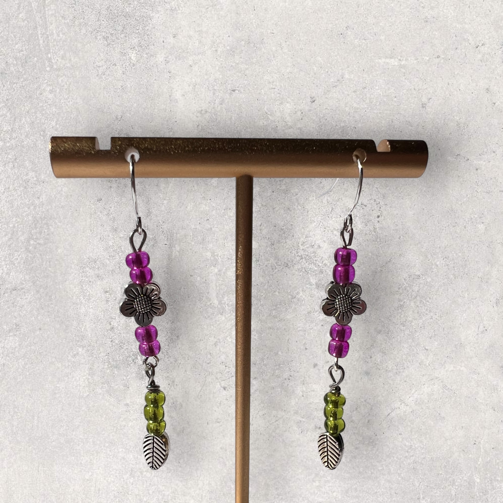 Step into the enchanting realm of nature's awakening with our exquisite “Silver Spring” Earrings. Crafted with meticulous precision and vibrant colors, these earrings capture the essence of springtime. Picture this: luminous beads in shades of pink reminiscent of blooming flowers, intertwined with fresh greens mirroring the first leaves of spring. Nestled between them, a delicate silver floral charm exudes elegance, while a dainty leaf-shaped dangle at the bottom gently sways, echoing the dance of leaves in the spring breeze.