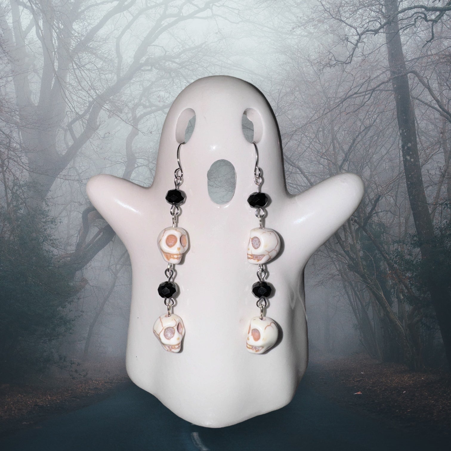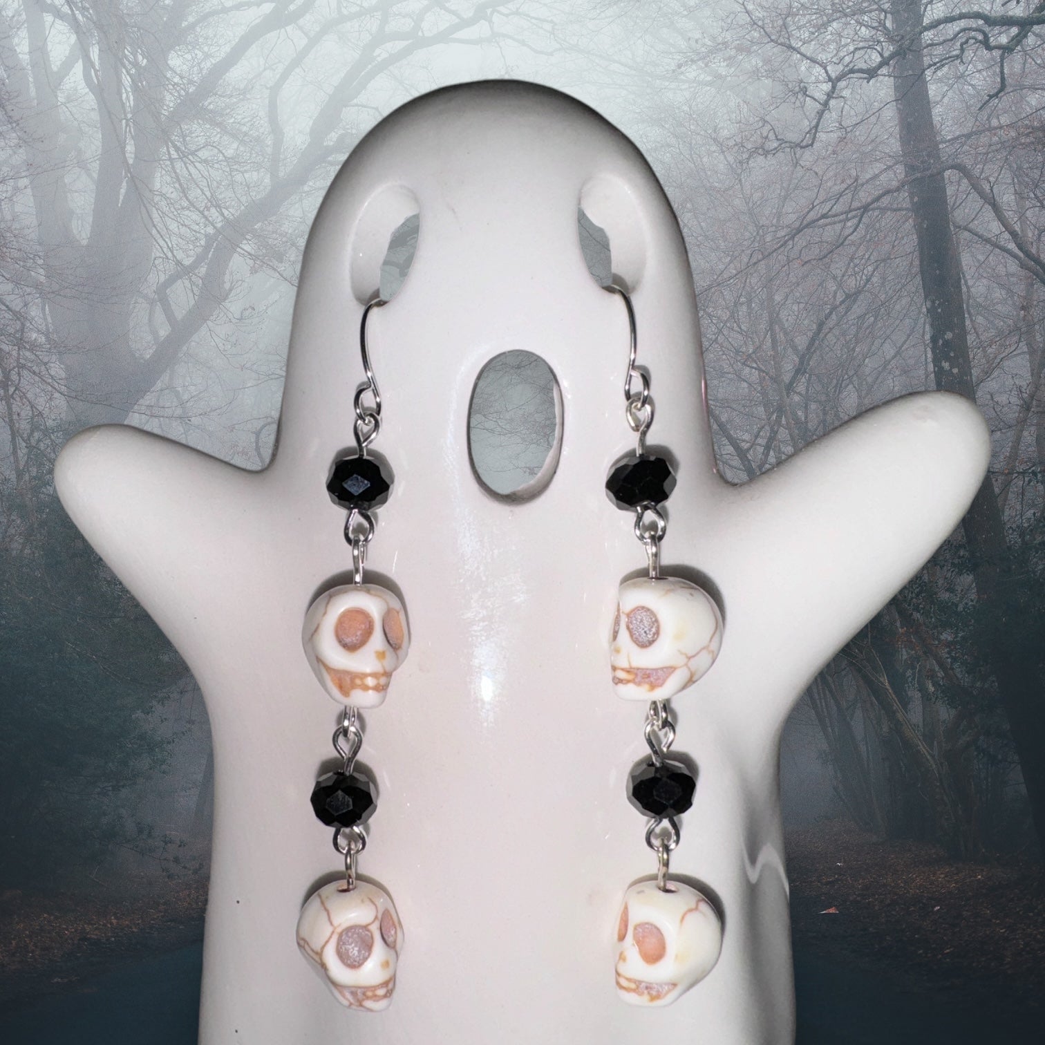 🖤💀Get ready for a spooky-chic Halloween with these Spooky Skull Cascade Earrings! Each earring features a hauntingly stylish pattern of silver skulls and faceted black beads, alternating to create a chillingly perfect balance. With two skulls and two gleaming black beads on each, these earrings bring eerie elegance to any Halloween ensemble. Crafted with silver hardware, they’re the perfect accessory for adding a ghostly glow to your festive look.🖤💀