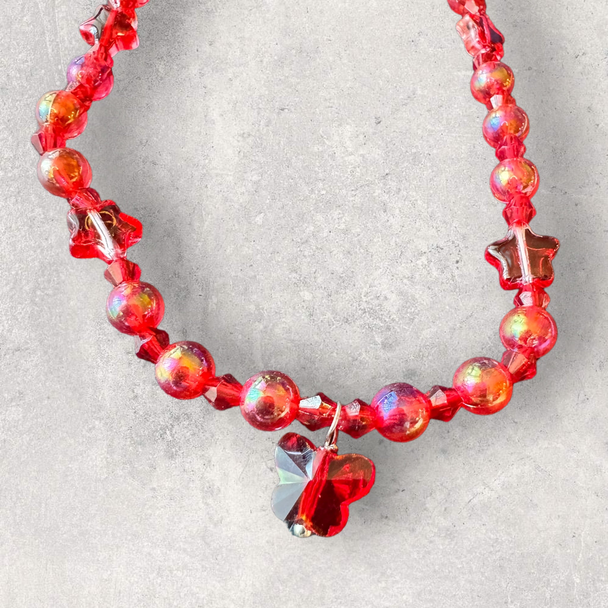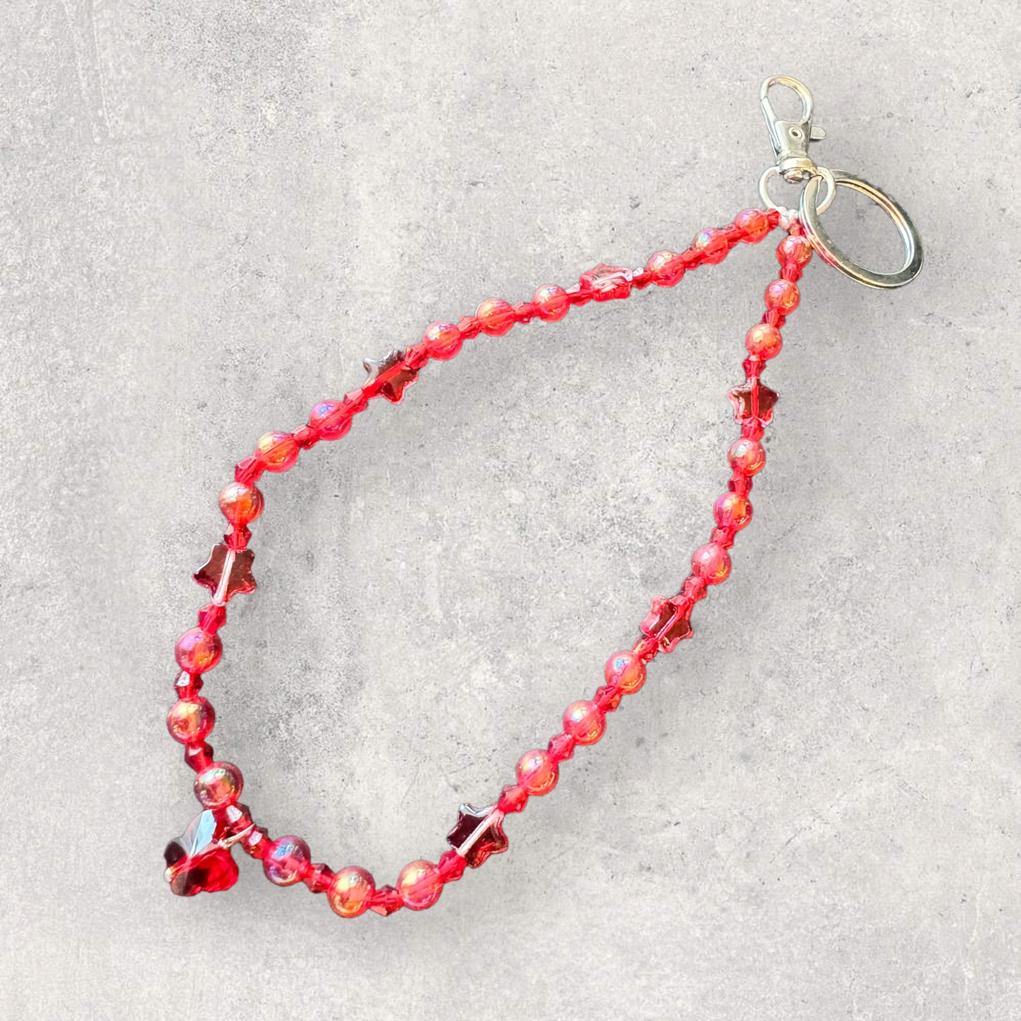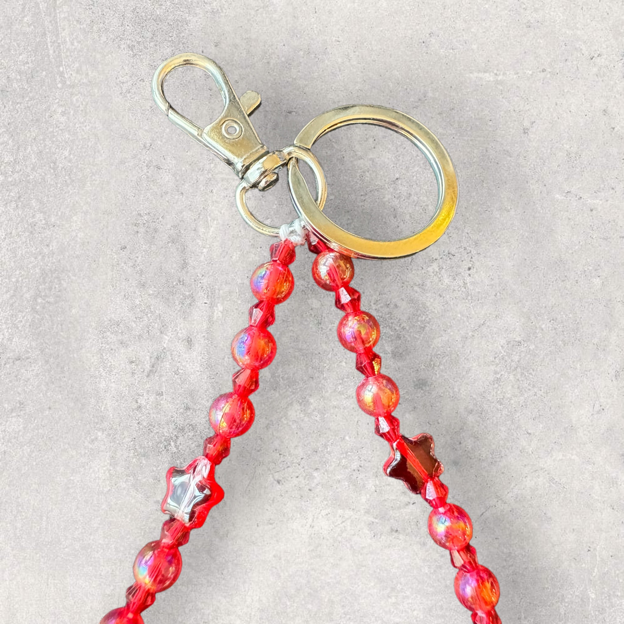 Introducing our “Stellar Butterfly” keychain. This keychain features a continuous strand of radiant red beads, each shimmering with an iridescent glow. The strands are connected to a silver-colored lobster clasp and key ring for easy attachment. Interspersed among the beads are small metallic charms, including stars, adding a touch of whimsy. The keychain is completed with a larger, prominent red charm in the shape of a butterfly at one end, symbolizing transformation and beauty. This keychain is not just a functional item but a fashionable accessory that adds a pop of color and personal style to your everyday items. 🦋🔑✨